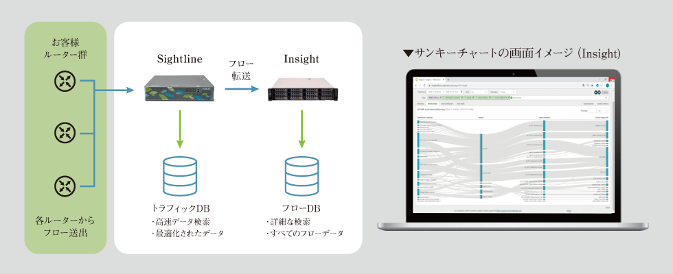 NetFlowの活用を実現する製品として採用したのは、業界スタンダードとなっているフローコレクターNETSCOUT社製「Sightline」だった。「機能やコスト面から複数製品を検討しましたが、最終的に導入を決めたのは Sightlineでした。機能的に豊富できめ細かい可視化が可能な点や、DDoS対策においてもデファクトの位置付けである点を評価しました。他の製品はフロー分析だけに特化するなど、機能に偏りがあったのです。運用形態としては、当社のトラフィック規模とサンプリング数などを考慮すると、SaaS型のサービスよりもオンプレ型の製品のほうが運用コストを抑えられると判断しました」(同社 KCS部 Network&Facility課 熊木美世子氏)