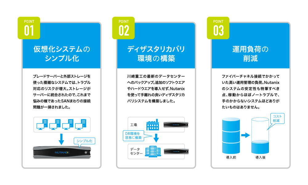 サーバー統合したブレードサーバーを導入して5年が経過しリプレースの時期となったため、適切なシステムの検討をはじめていました。特にSANの運用で苦労していたため、運用負荷が削減できる、サーバー、ストレージ、そして仮想環境までがオールインワンで導入・運用ができるプロダクトを中心に探していました。また、ちょうど川崎重工グループ内でBCP対策強化の動きもあり、BCP、特にディザスタリカバリ(以下、DR)に対応しやすいという点が重要な検討ポイントでした。