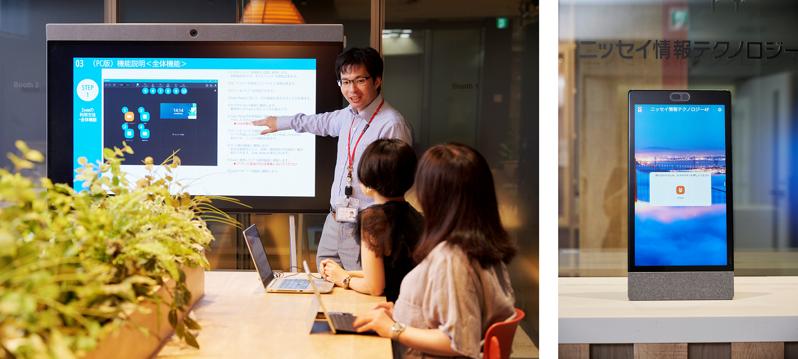 「出社する社員が増えてくると、隣同士の席で会議に参加することも増えてきて、ハウリングや相手の会議中の声が気になるなどの不都合が出てきました。そこで日商エレクトロニクスに相談したところ、紹介されたのがZoomのテレビ会議システムであるZoom Roomsと専用ハードウェアであるNeatでした」(倉上氏)