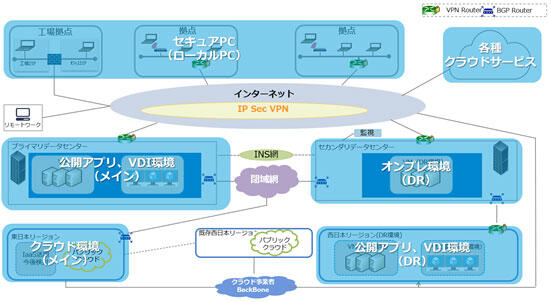 BCP対策として災害時を想定した新データセンターを構築した。常時利用するシステムは予め費用を把握できるオンプレミスで構築し、発生の見通しが難しい災害時用の VDI は従量課金のクラウドで構築した。日商エレのオンプレミス、クラウドの知見を生かして双方良いとこ取りの仕組みを実現した。
