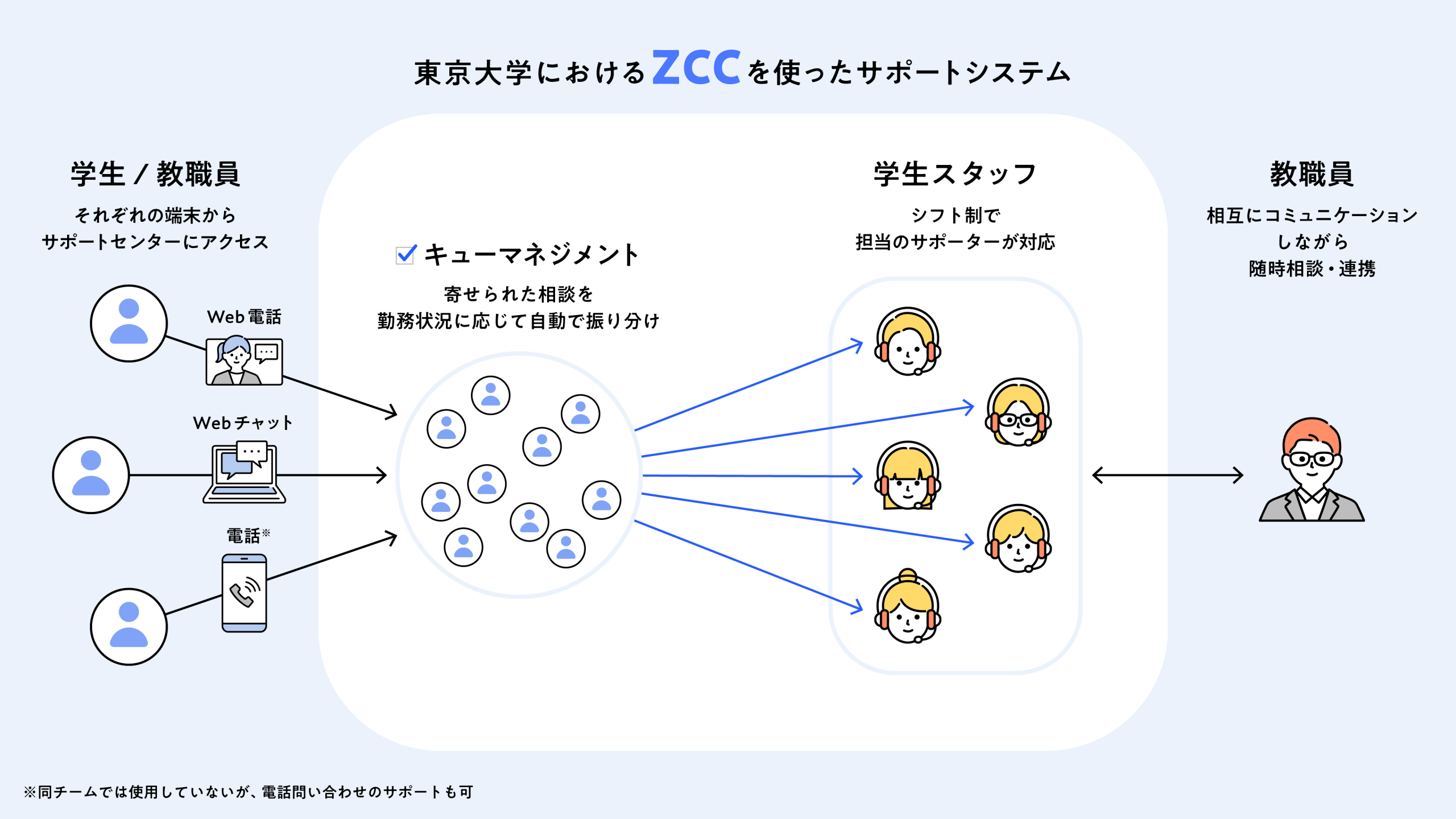 ZCCはコールセンターやカスタマーサポートでの利用を想定して開発されたツールで、WebサイトからのチャットやWeb通話(※同学ではカメラオフ、問題解決に必要な画面共有のみで使用)、電話(※同学では不使用)など、ユーザーからのマルチチャネルの問い合わせをまとめて管理できます。