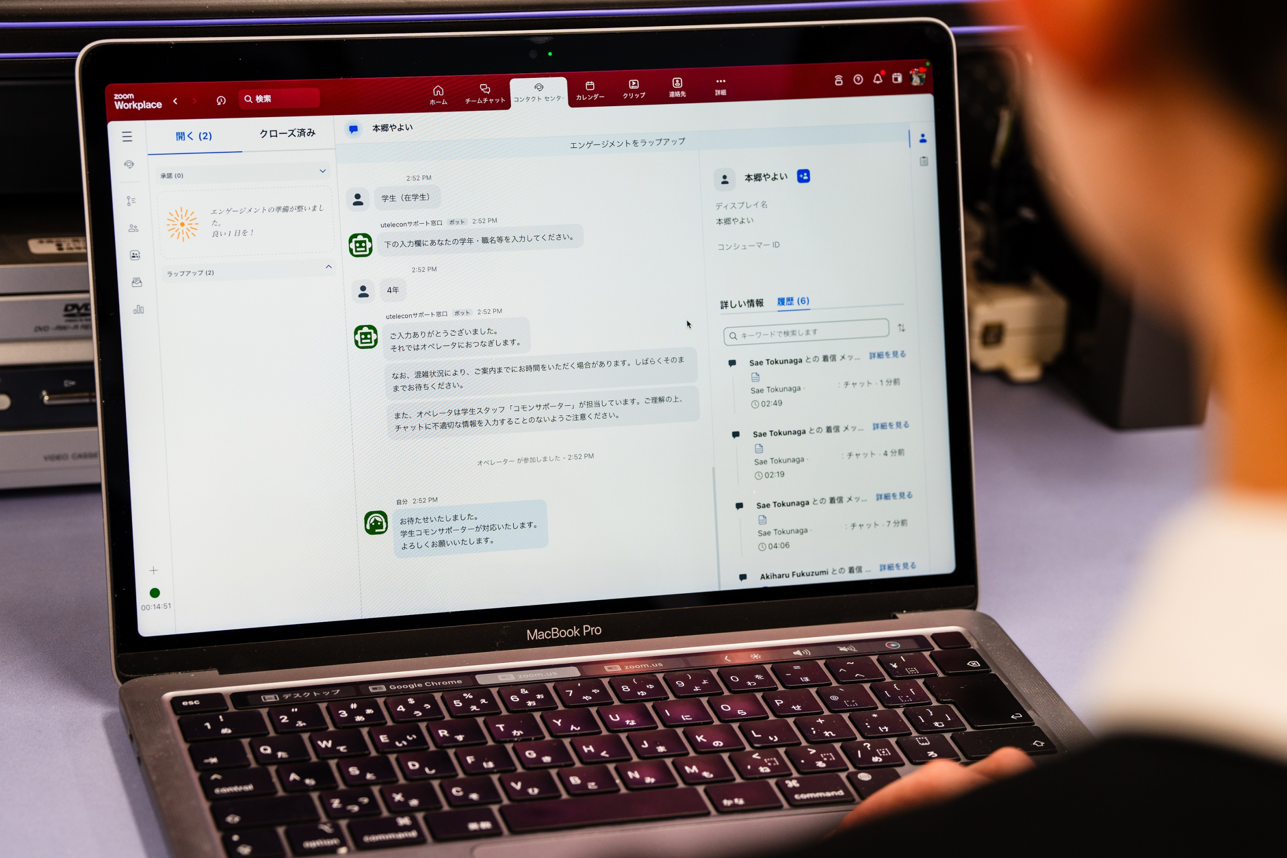 「ZCC導入前は問い合わせチャネルごとに管理ツールを使用しており、通知が来たらツールを立ち上げ直したり、画面を切り替えたり、煩わしさを感じていました。ZCCに一本化されたことで、基本的にはZoomアプリの該当タブだけを見ていればよくなりました」(教育学部4年 福積輝大氏)