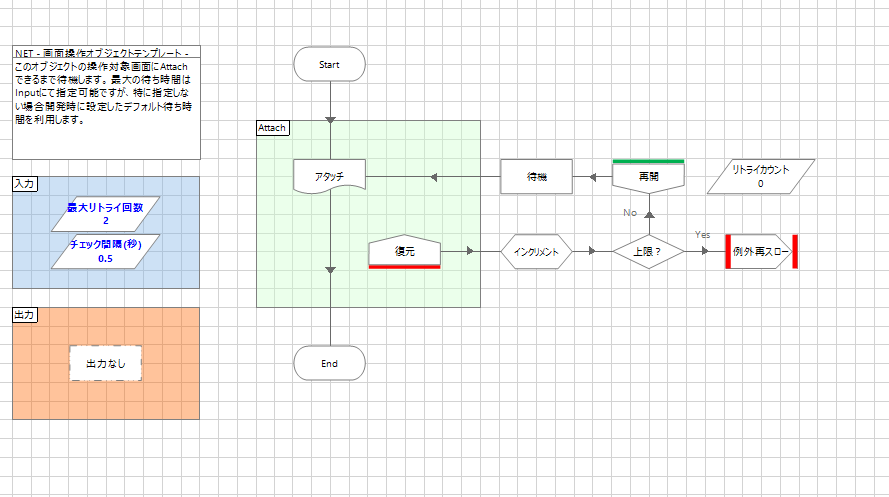 「画面表示待機」アクションも、アタッチに次いで画面オブジェクトテンプレートにおいて重要な役割を持っています。このページはプロセスにも公開しますが、基本的にはオブジェクト内でアタッチするときにも直接アタッチページを呼び出すのではなく、代わりにこのページを呼ぶようにすることでプロセスから呼び出し不要にします。実装自体は単にアタッチをリトライループで囲っているだけですが、このページを標準で用意してあることで、「画面表示が少しだけ遅かった」というシチュエーションでもわざわざプロセスに処理を戻さずに簡潔にオブジェクト側でアタッチをリトライできます。リトライのパラメータ(回数など)は入力データアイテムになっていますが、オブジェクト内から使う際は指定しなければデフォルトのパラメータを使うことが可能です。プロセスから呼び出すシチュエーションについては「★プロセスからの呼び出し方」の節で説明します。