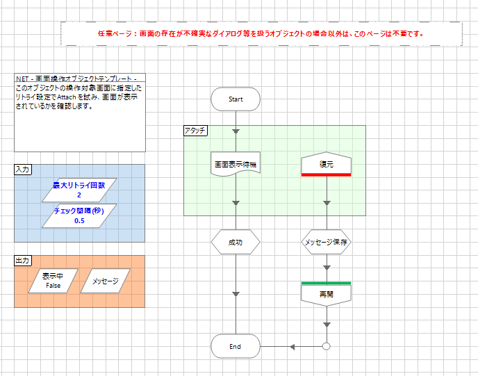「画面表示確認」は実装としては単に画面表示待機を呼び出したとき、エラーだったかどうかをフラグ型でプロセスに戻すためのテンプレートです。少し特殊な点として、このページは弊社テンプレートの中では操作対象画面ごとに任意(不要であれば削除したり非公開にしてよい)のものとして扱われています。というのも、このようにフラグ型でアタッチの成否をプロセスに伝えたいときというのは、「対象画面が表示されているかどうかによって処理を分岐させたい」という状況です。「前の画面でこのボタンを押したら必ず画面が出るはず」といった固定的な画面では、この機能が必要になることはありません。表示されていなければエラーにしてシステム起動などからリトライするしかないからです。逆に処理中のデータなどに依存して表示される警告ダイアログなどについては、表示されるかされないかを事前に判断できない(=アタッチしてみて失敗したら出なかったと判断する)ためこのページがあるとプロセス側の作りがシンプルになります。