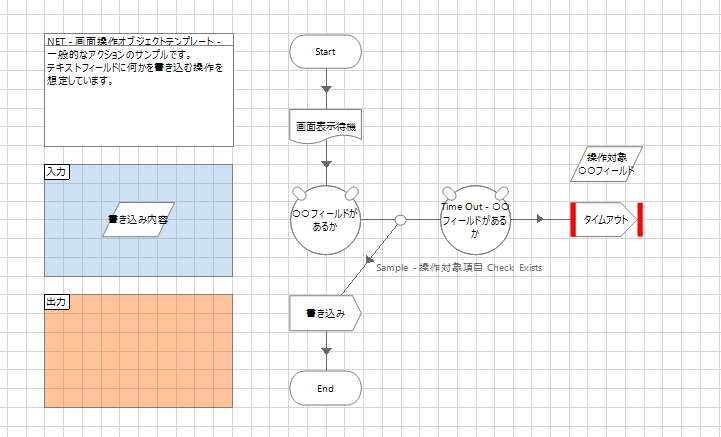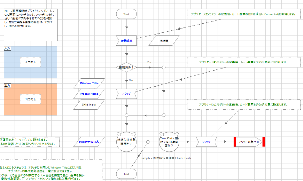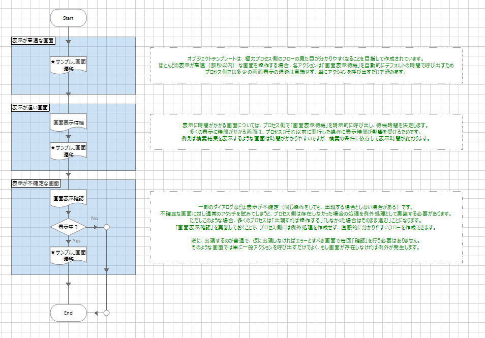 最後の「★プロセスからの呼び出し方」は名前の通り、ここまでのページをどのようにプロセスから呼び出して利用するのかを説明したページです。実際にオブジェクトを作成した際は、このページは削除してしまってからレビュー依頼やリリースするとよいでしょう。ページ内コメントにも記載がある通りですが、プロセスが画面を操作する際には「表示が高速な(とりたてて遅くない)画面」「表示が遅い画面」「表示が不確定な画面」の3パターンを考慮しておく必要があります。画面オブジェクトテンプレートはどのパターンでもプロセス側の実装がシンプルで済むように作られています。表示が高速な画面では、各操作アクションの最初に「画面表示待機=アタッチ」が自動で行われるためプロセスは何も考えずに好きなアクションを呼び出せます。表示が遅い画面ではプロセスにも公開されている「画面表示待機」に、その業務で必要な(妥当な)分だけ待機時間を設定してから操作に移ることで安定した操作が可能になります。また表示が不確定な場合は「画面表示確認」で説明した通りです。