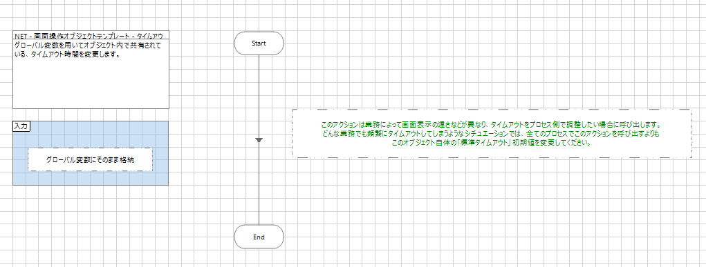 「タイムアウト設定」は初期化ページに配置した標準タイムアウトを、プロセスから書き換え可能にするためのアクションです。Blue Prismのオブジェクトは業務をまたいで共通に利用する前提のため、画面によっては「普段は高速だけどこの業務ではデータ量の関係で画面操作に時間がかかる」というシチュエーションが発生することがあります。そのような画面オブジェクトのタイムアウトを標準で伸ばしてしまうと無駄に待ち時間を増やすことにつながりかねないため、このアクションでプロセスからタイムアウトを変更させます。ただし説明にもある通り、そもそもの標準タイムアウト時間を延ばしておく方が適切なケースも多く、どんな画面でも必要というものではありません。とはいえこのページは不要でもテンプレートのまま置いておくだけで、あって損することもないため弊社では全画面に標準実装としています。