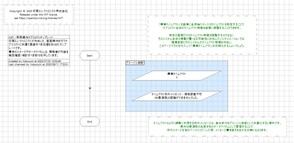 「標準タイムアウト」はそのオブジェクトの待機ステージに使用するタイムアウト値です。グローバル変数で集中管理することで、全体的にタイムアウトを伸ばすような改修が容易になります。ページ内のコメントにもありますが、頻繁かつシステム全体的なタイムアウト見直しを見込む場合には、システム単位の環境変数から読み込むようにすると、より変更が容易です。