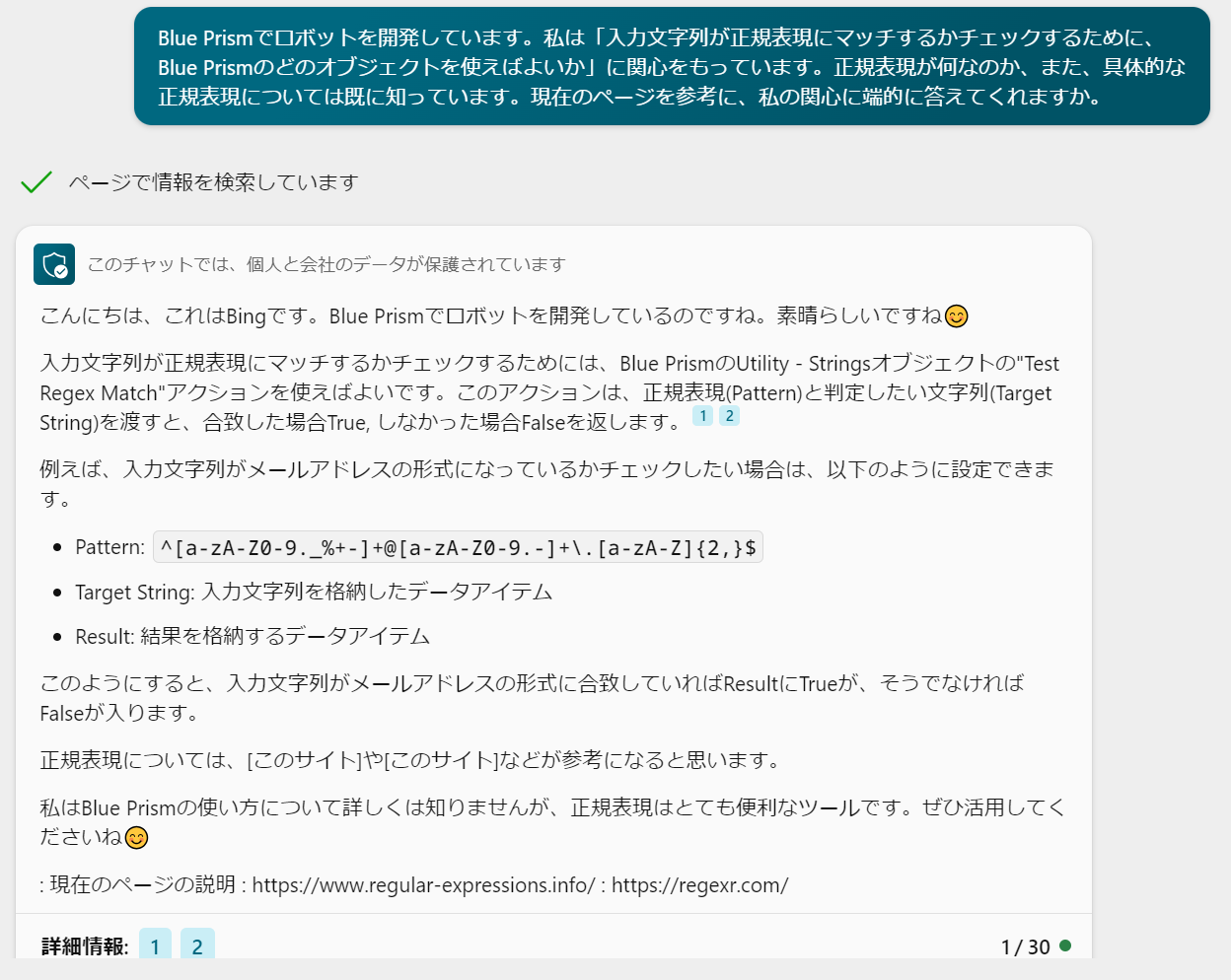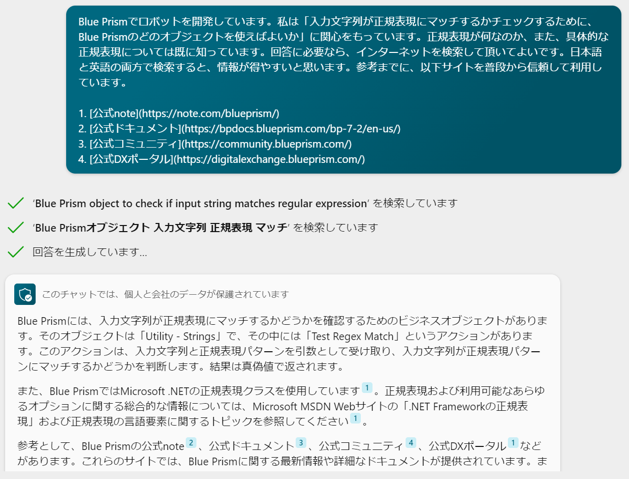 宿題としていた「Blue Prismで正規表現を使用する方法」を、Bing Chat Enterprise先生に教わりましょう。