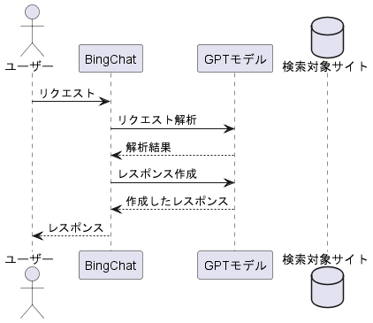 ChatGPTのブラウジング機能のように、AI自身がインターネットを検索する場合、ログインが必要なサイトにアクセスできません。しかし、Bing Chat Enterpriseのこの機能は、AIの利用者がサイトにログインし、ページをEdge上に表示すればよいです。以下の図(筆者の観察結果にもとづき作成)で言えば、ユーザーからBing Chat Enterpriseに対するリクエストの中に、閲覧しているページの情報が含まれるようです。ユーザーが質問欄にページの情報をコピー&ペーストするのと、本質的に変わりません。したがって、Bing Chat Enterprise自身は、検索対象サイトにアクセスする必要がないです。