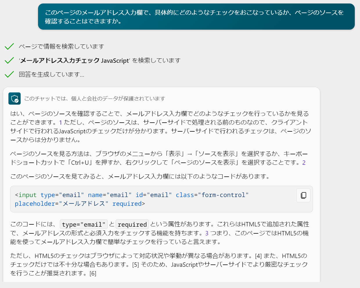 シンプルながら、応用範囲の広い機能です。たとえば、当社が運営するWebサービスの「パスワードの再発行」ページをEdgeに表示した状態で、メールアドレス入力欄の入力チェックについて、Bing Chat Enterpriseに聞いてみたところ、一見正しい回答が得られているようでした。このような使い方は、Webサイトを自動操作するロボットの開発時に役立つ可能性があります。ただし、Bing Chat Enterpriseは、ページの情報の一部が見えておらず、不足部分を想像で補って回答しているようにも見受けられました。自動化のヒントとして使うだけでも十分便利ですので、開発者自身が回答を検証しつつ、利用するのがよいかと思います。