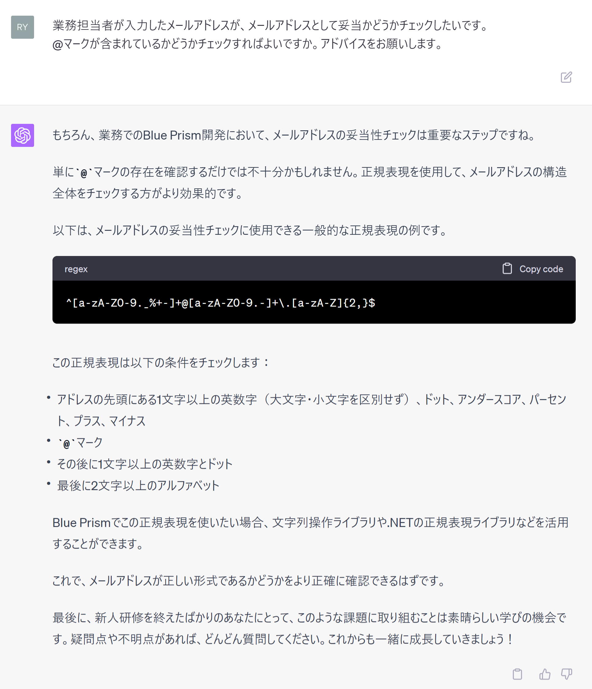 さて、RPAロボット内で、入力された文字列の妥当性(例:メールアドレスとして妥当か?)をチェックしたい場面があると思います。ChatGPT先生に質問してみましょう。