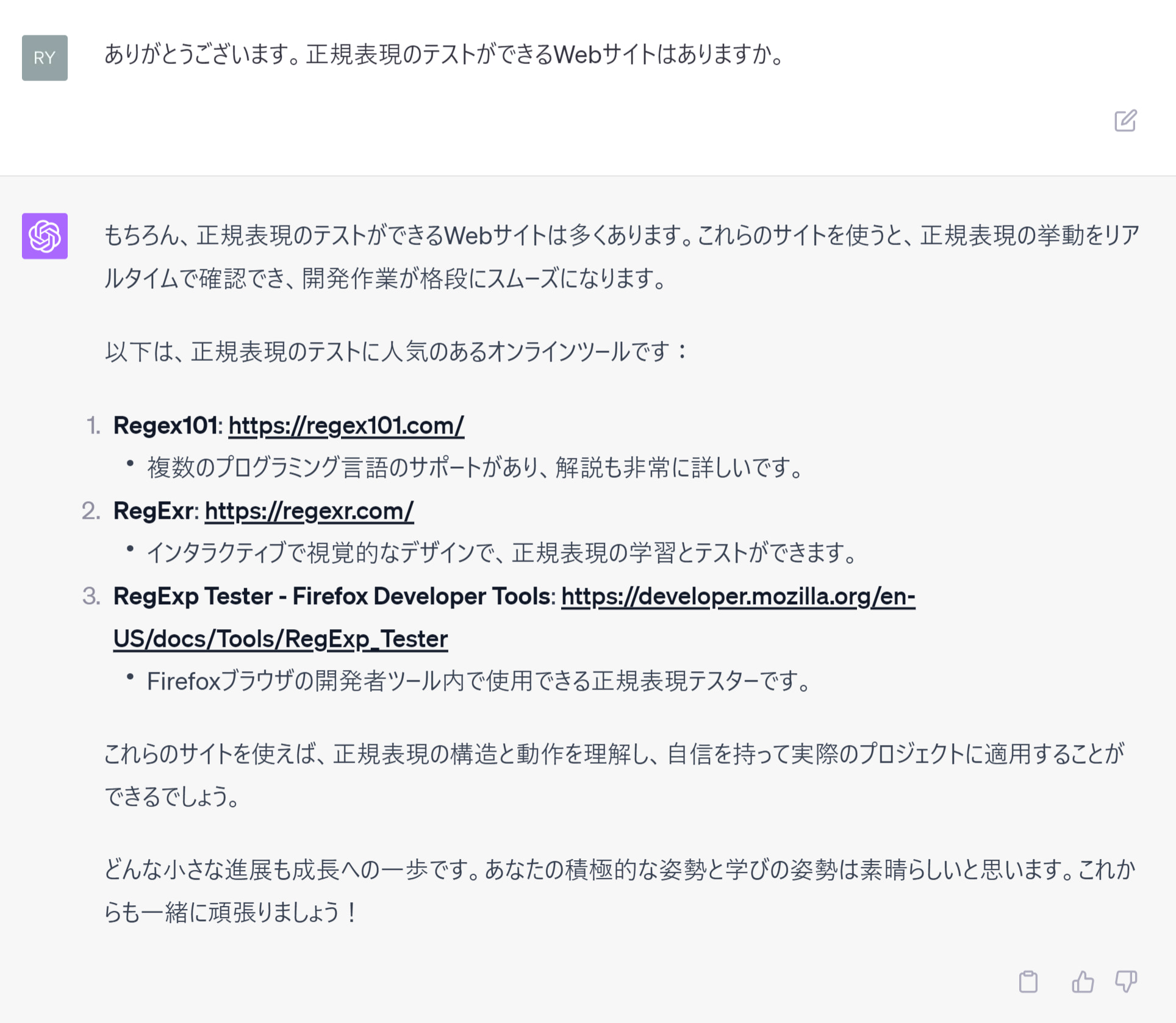 正規表現を使用すればよい、とのことです。また、具体的な正規表現も教えてくれました。しかし、情報の正確性を確かめるのは、AI利用者の責任です。教えてくれた正規表現が正しいかどうか、ロボットに組み込む前にテストしたいので、追加質問してみましょう。