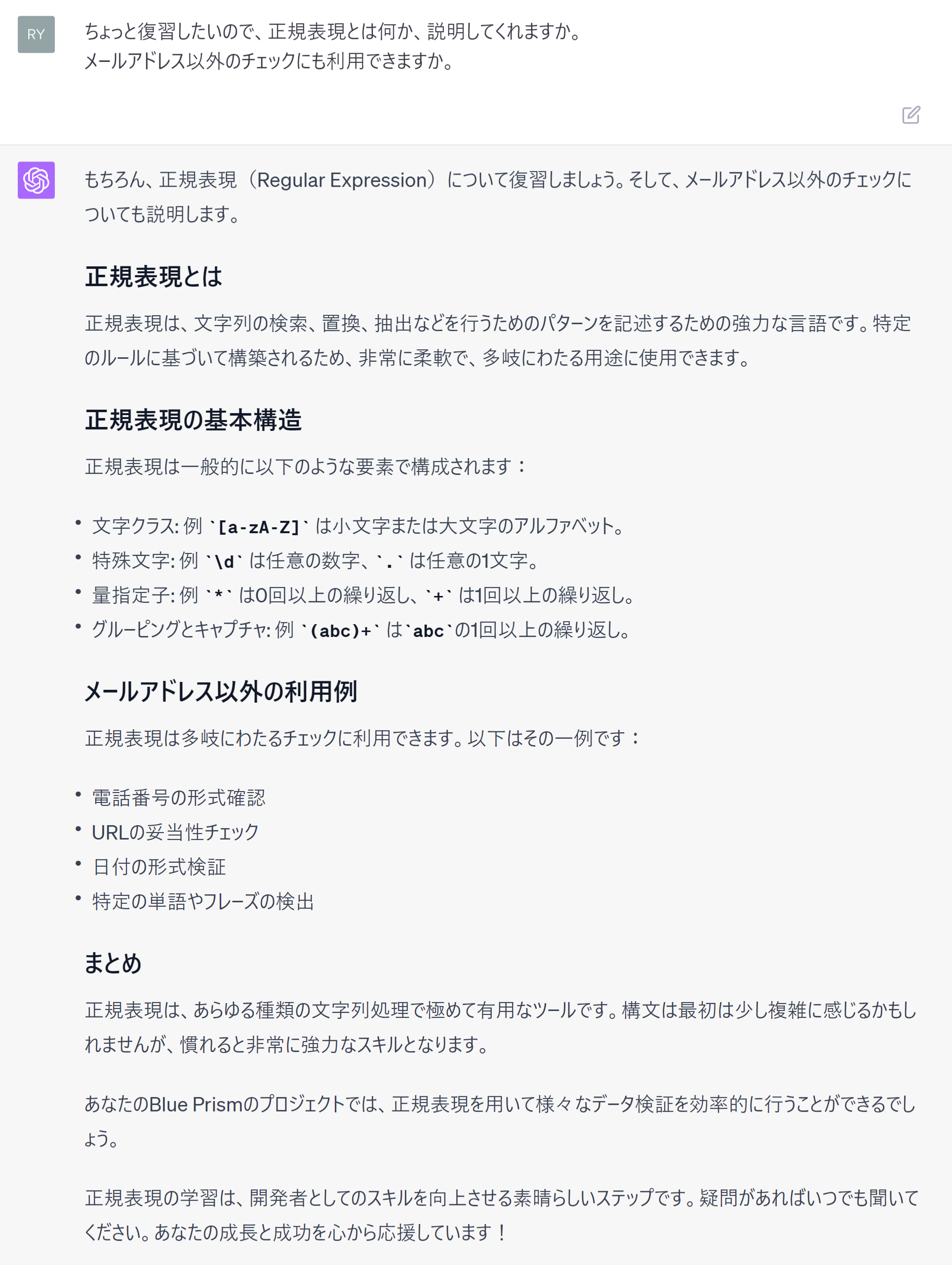 このセクションでは、ChatGPTに質問し、Blue Prismの開発に関する疑問を解決する例をご紹介します。