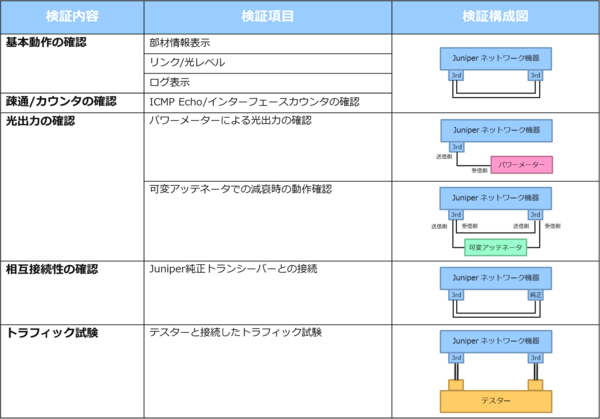 Juniper Networks社の様々なネットワーク機器を用いて接続検証を行った結果を、以下表に示しています。