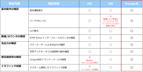 A社、B社の光トランシーバーでは共にネットワーク機器側の機種により、パケットロス、リンクダウン、リンクフラップやリンクアップしないなどの事象が発生しました。一方、ProLabs社の製品は基本動作、純正品トランシーバーとの接続、トラフィック試験など、弊社で実施したすべての検証項目において、問題なく動作することを確認できました。 以上のことから、ProLabs社の光トランシーバーとJuniper Networks社の機器との相性は良好という結果となりました。