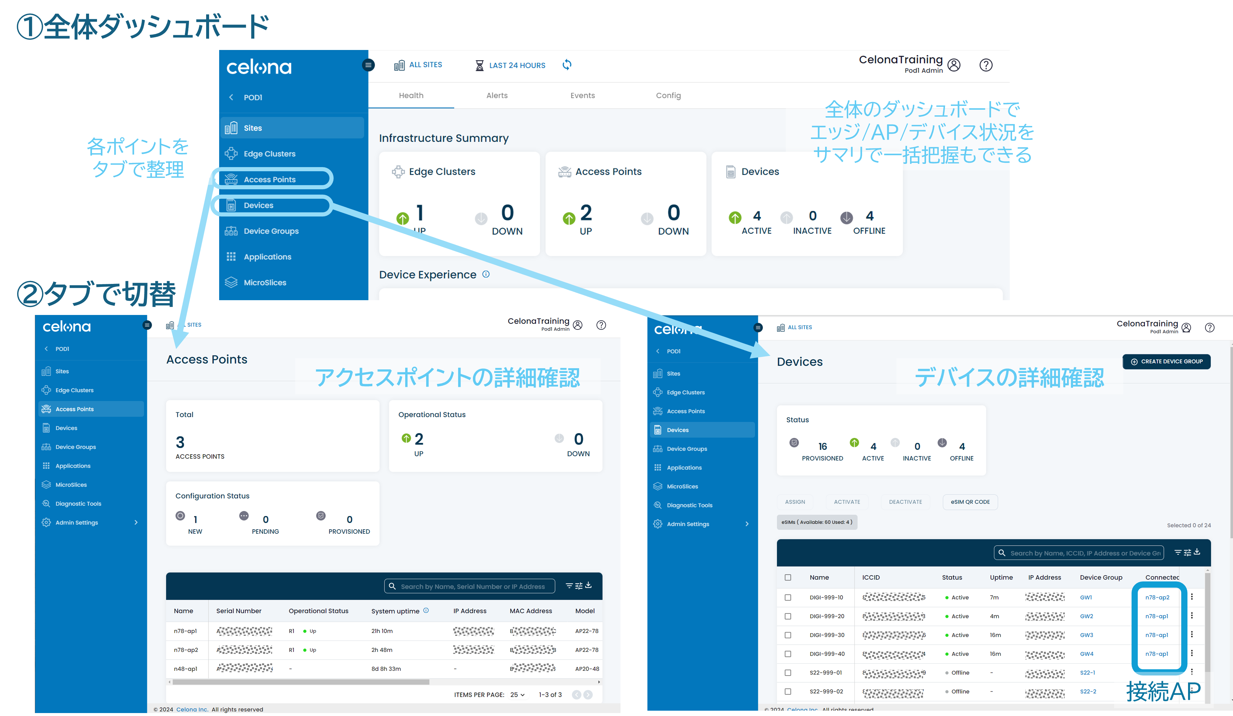 Celona Orchestratorでは、GUI上で全体ダッシュボードからアクセスポイントと接続デバイスの状態をリアルタイムで可視化することでアクセスポイントの稼働状況や、どのデバイスがどのAPに接続しているかが一目でわかり、障害発生時の迅速な原因特定が可能で、トラブル対応の時間を大幅に短縮できます。