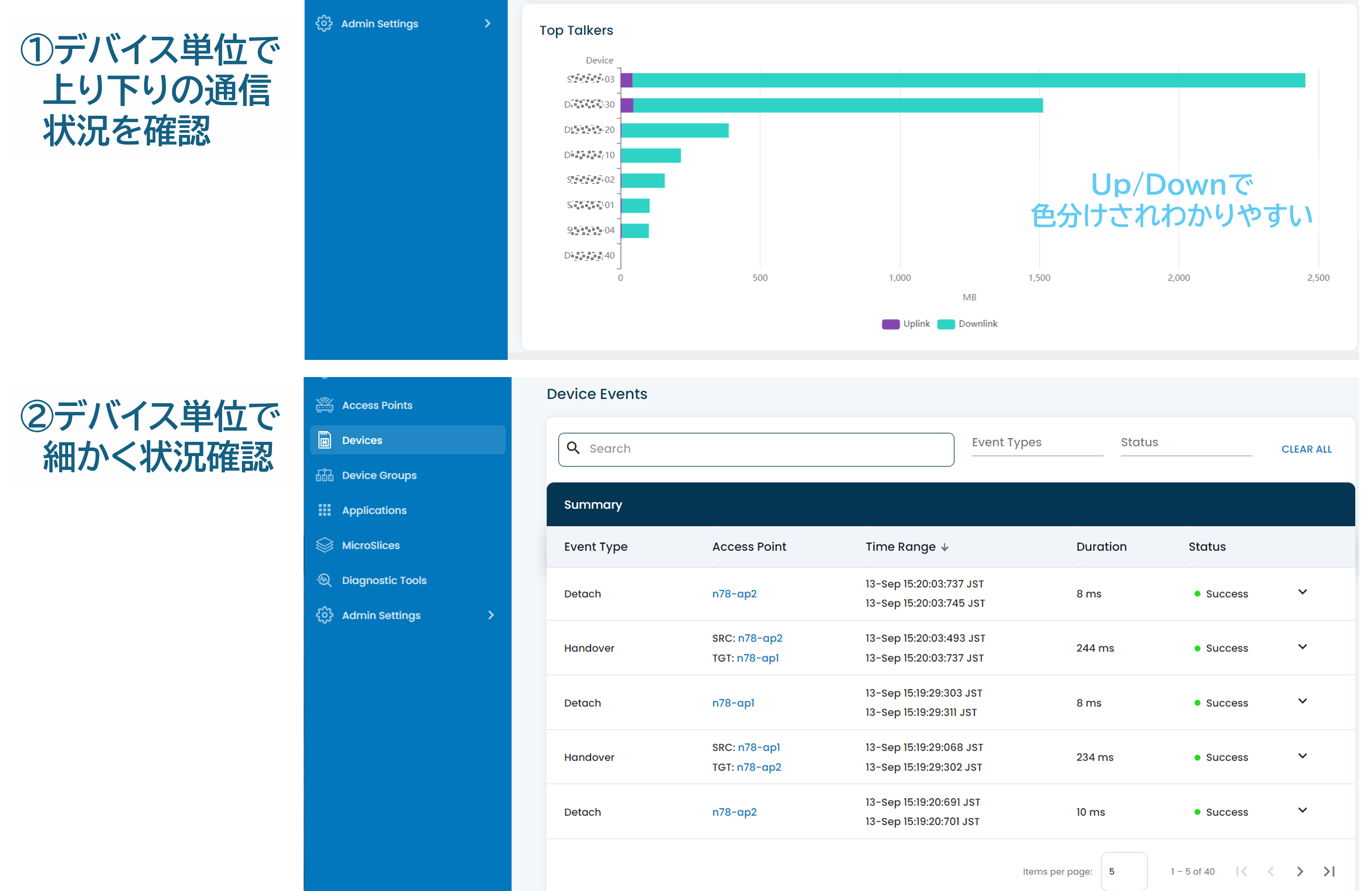 ローカル5Gでは、アクセスポイントと複数のデバイスが接続され、通信が行われます。どのデバイスがどのアクセスポイントに接続されているのか、また通信が正常に行われているのかを確認するのは、従来のCLI等では把握が難しく煩雑でした。
