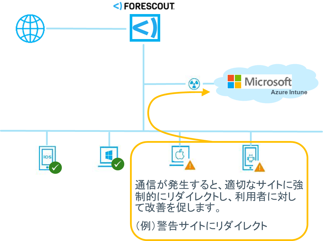 デバイス登録の時と同様にForescoutのデバイス制御機能により、非準拠のデバイス をベースラインを満たすまで特定のサイトにリダイレクトし、改善を促します。 - 3.セキュリティ事故発生リスクをさらに軽減