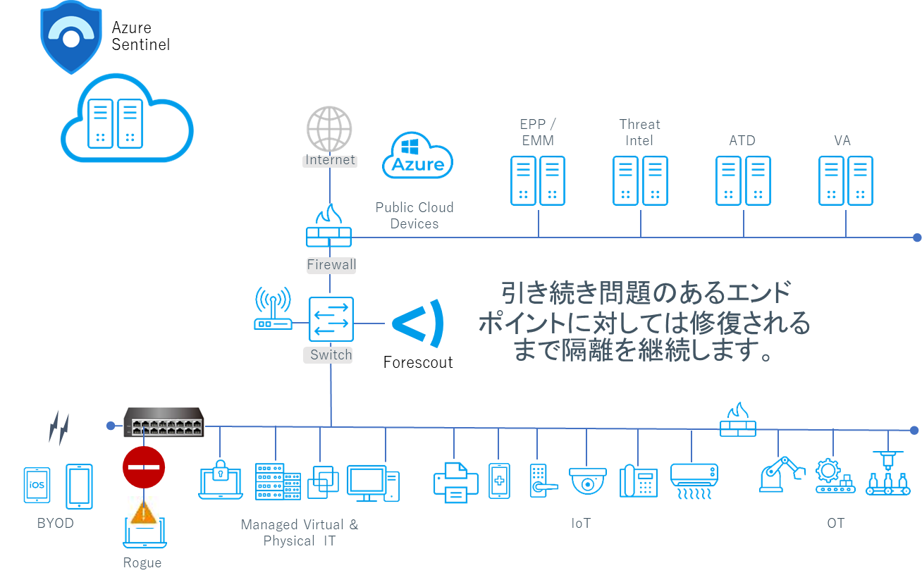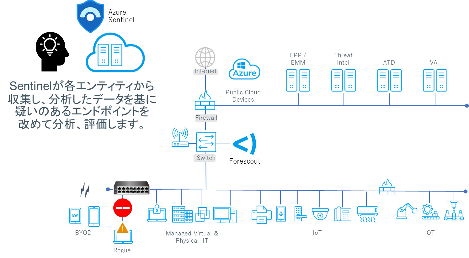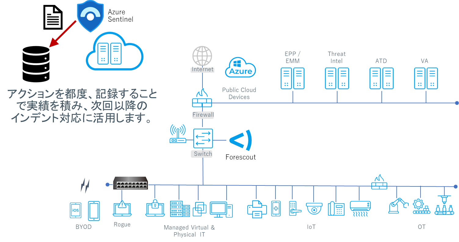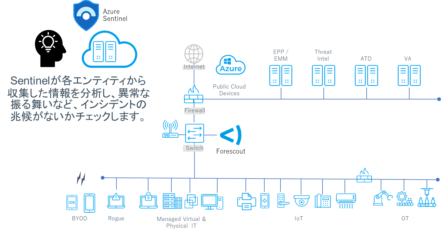 今回はMicrosoft Sentinelが統合したデータを分析し、Forescoutとの連携によってインシデントの兆候の発見からそのインシデントに自動的に対処して行く様子を見て行くことにします。