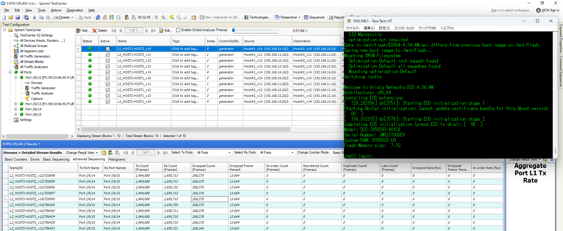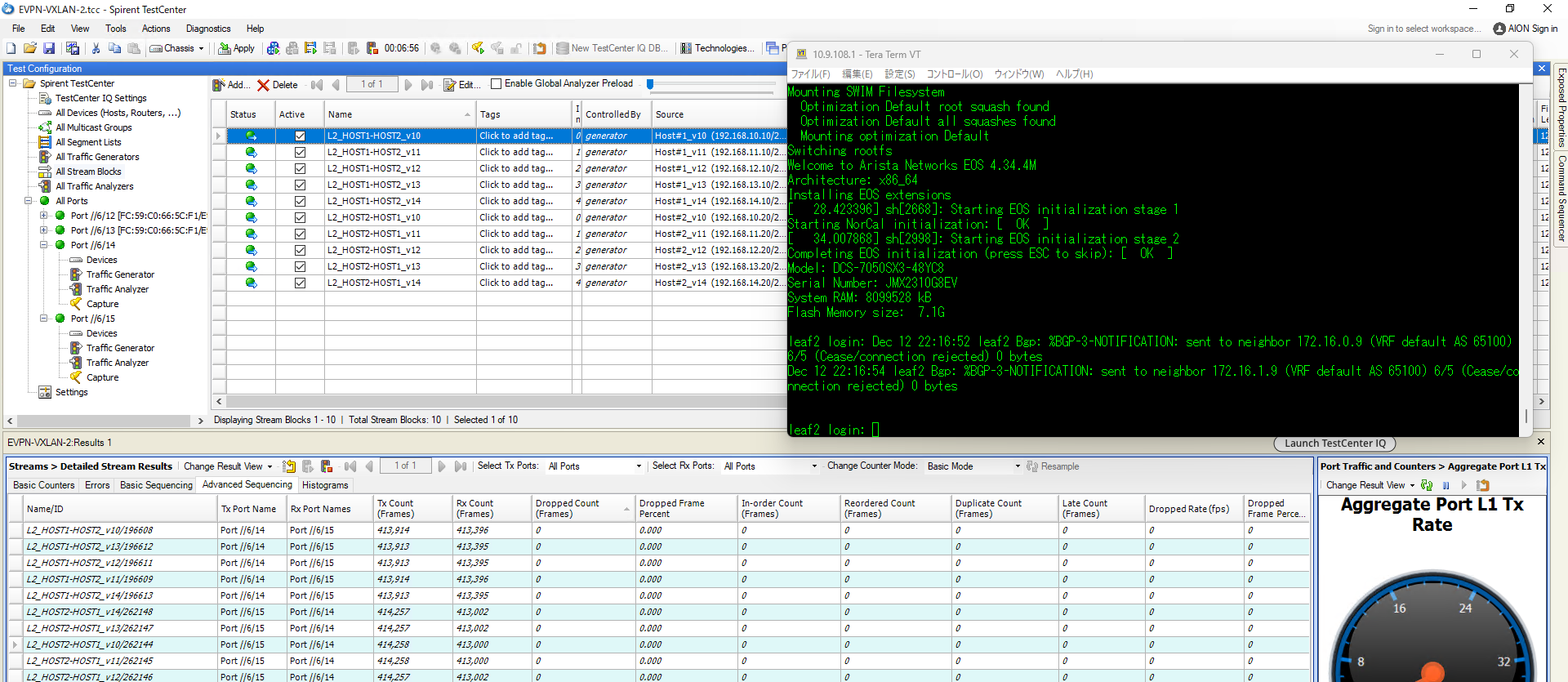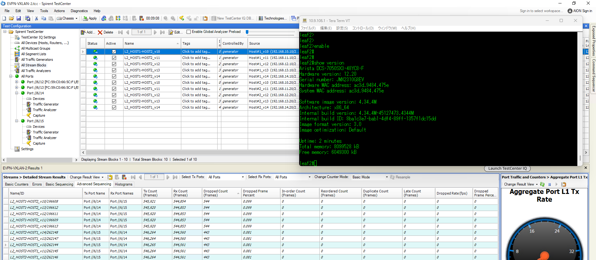 Spirent TesterをLeafに接続し、ホスト間で双方向にトラフィックを送信
