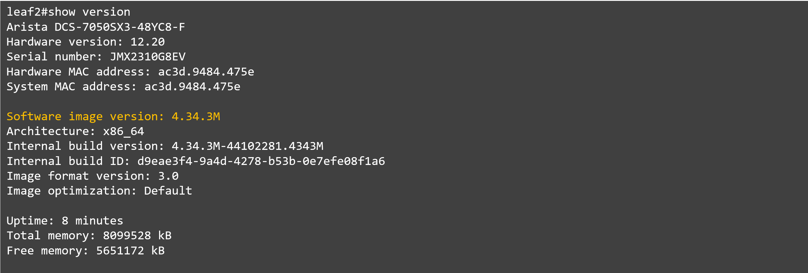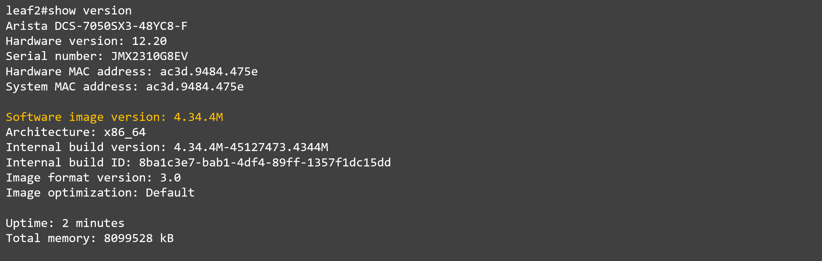 "show boot-config"で EOS64-4.34.4Mが指定されていることが確認できます。