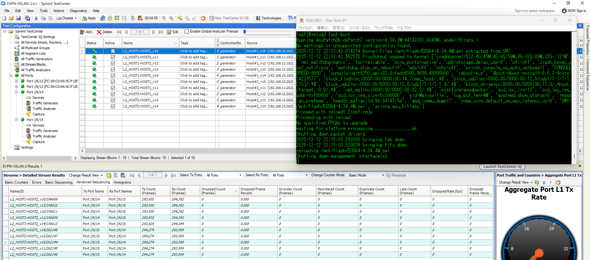 今回の検証では、Spine-Leaf構成でLeaf#2を対象にSmart System Upgrade(SSU)を実施し、Spirentでトラフィックを送信しながら通信断を計測しました。通常のアップグレードでは、コントロールプレーンとデータプレーンが同時に停止するため、約 270秒の通信断 が発生しました。一方、SSUではデータプレーンを維持したままコントロールプレーンを再起動するため、通信断は 約0.5秒(1秒未満) に抑えられました。