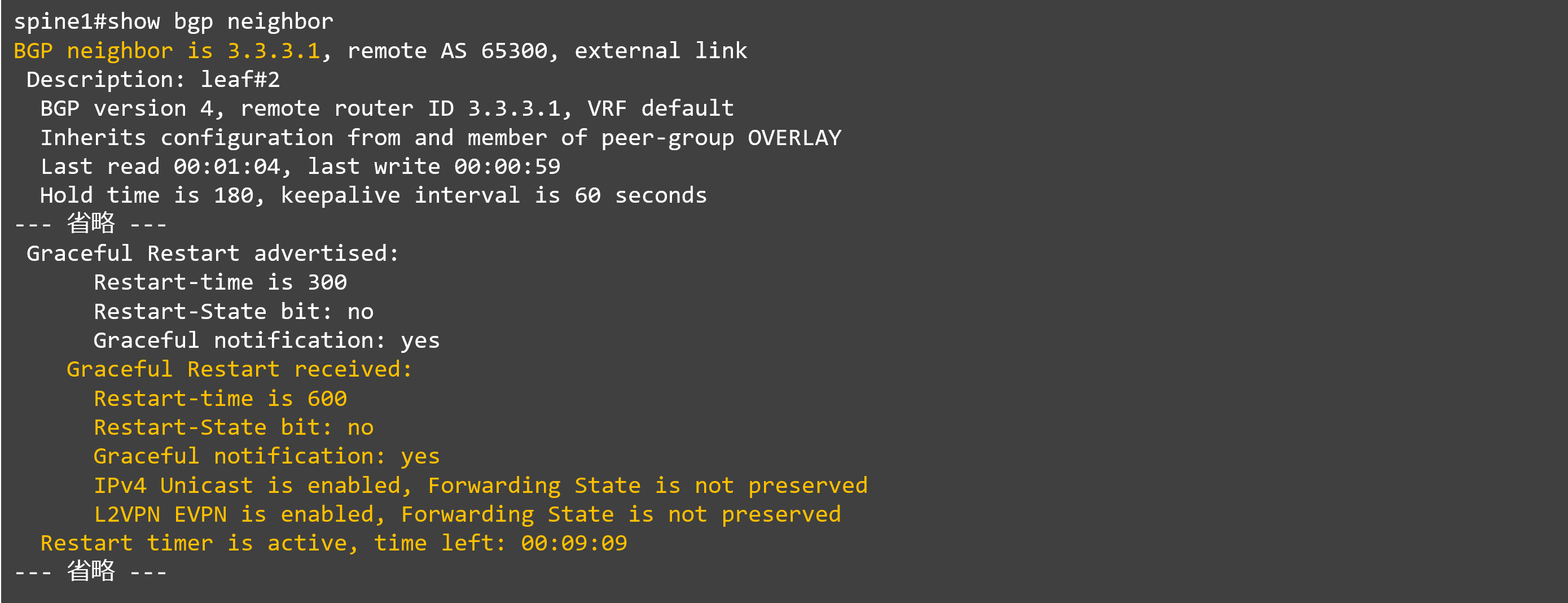Spine#1で"show bgp neighbor"を確認すると、Leaf#2(3.3.3.1)でグレースフルリスタートタイマーが動作していることが確認できます。