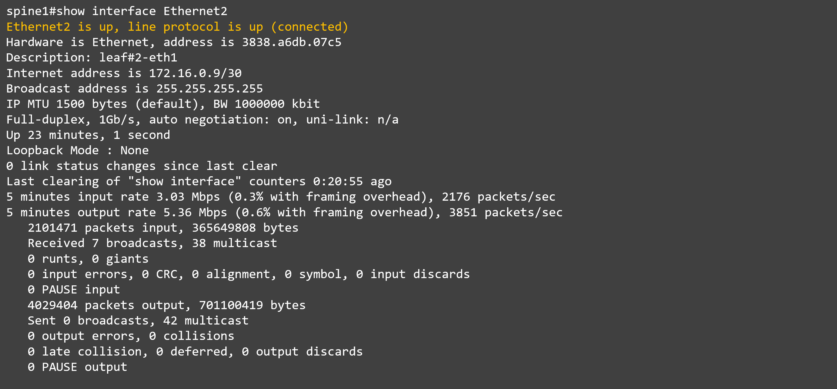 "show interface Ethernet2"でSpine#1のLeaf#2向けのインターフェースがアップしていることが確認できます。