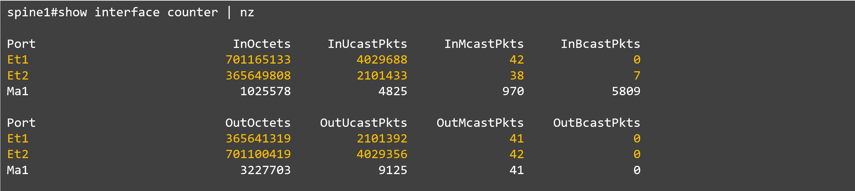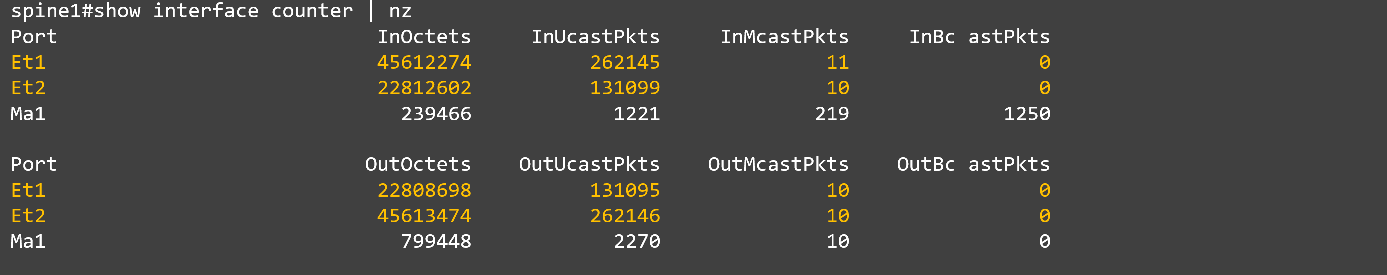 "show interface counter"でLeaf#2、Spine#1の全てのリンクにトラフィックが流れていることが確認できます。(Leaf#1、Spine#2も同様)