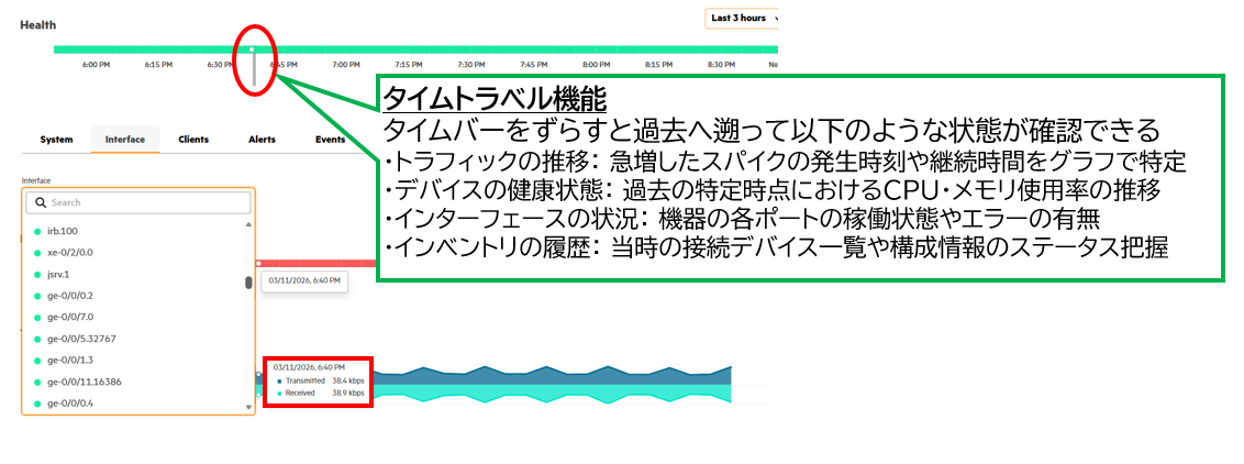 障害対応で大きな壁となるのが、既に消えてしまった過去の状態や事象の把握です。Aruba Centralなら、タイムバーをスライドさせて過去の任意時点の状態を即座に確認できるため、ログやキャプチャを遡る手間を省き、原因特定までの時間を大幅に短縮できます。