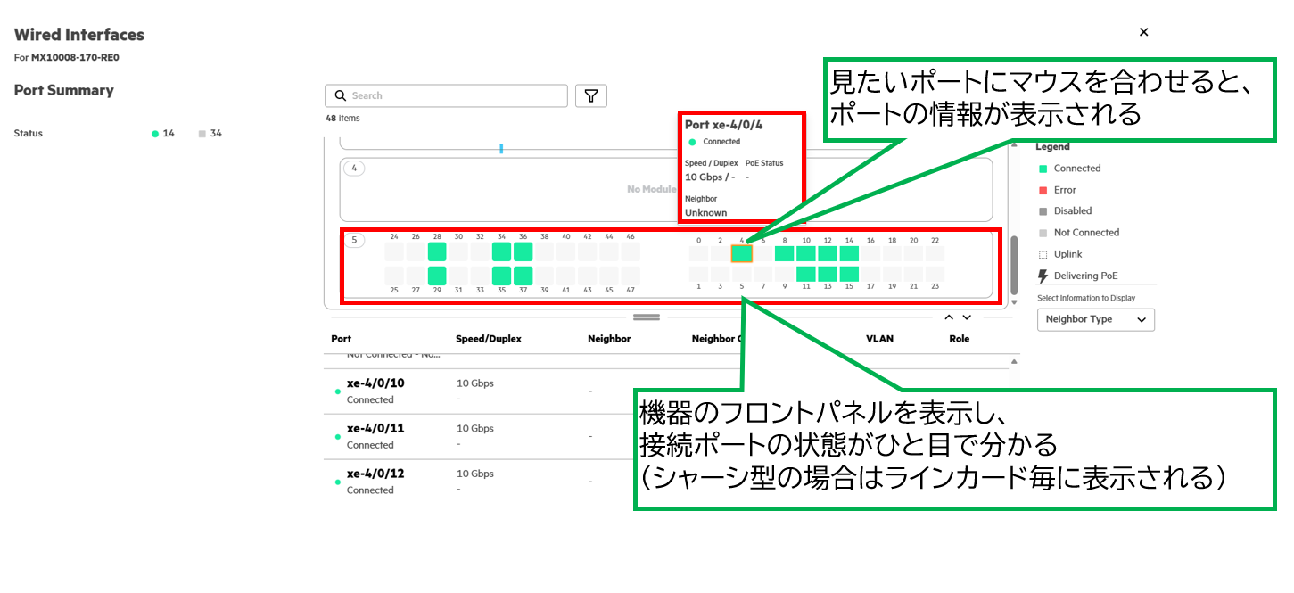 以下の画像は、HPE Juniper社のシャーシ型ルーター「Juniper MX10008」ですが、シャーシ型機器の場合はラインカードごとの図が表示がされます。