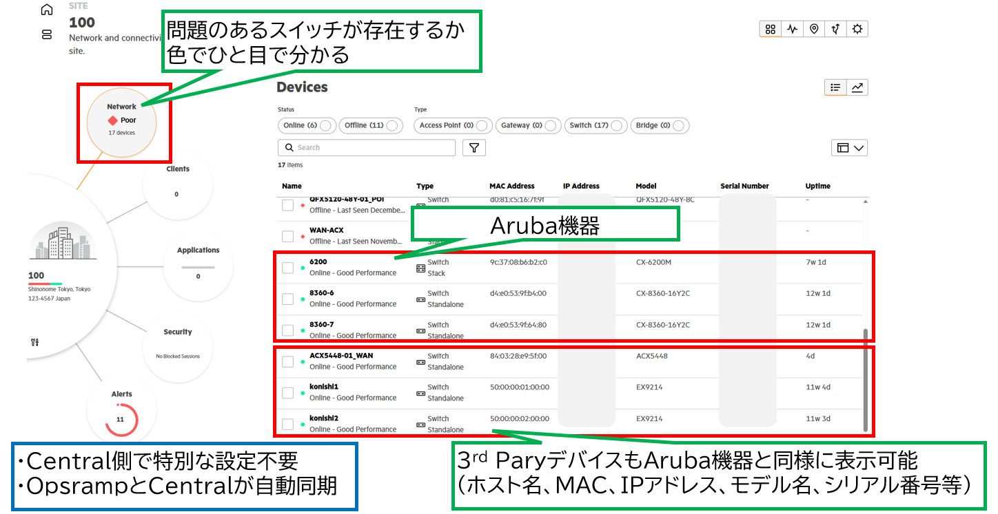 Aruba Central のデバイス一覧にHPE Aruba製スイッチと並んで、他社製デバイスが表示されています。これまで難しかったマルチベンダー統合監視がいよいよ実現されました。