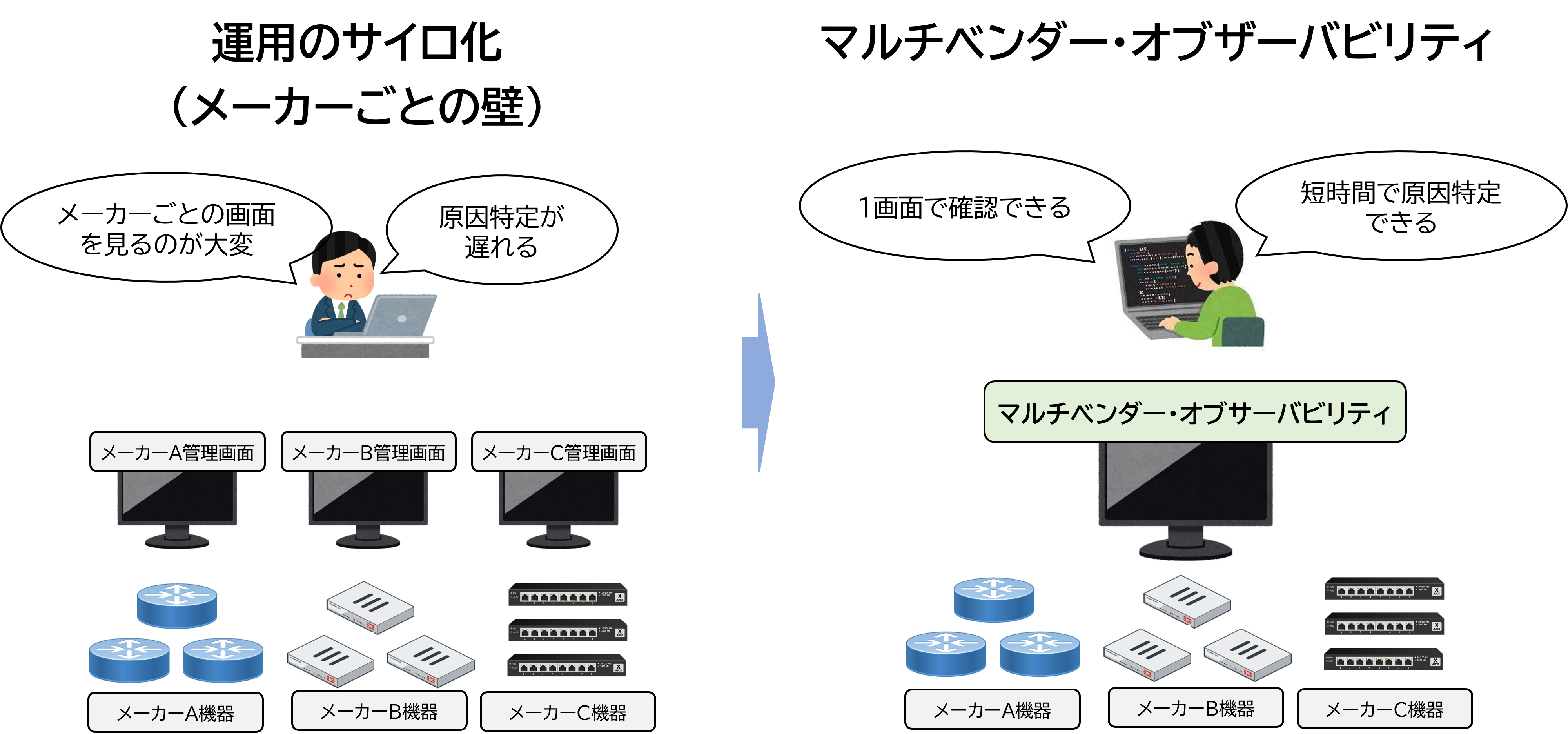 従来は、マルチベンダー環境での運用は各ベンダーの深い知識が不可欠で、そのベンダーに詳しい担当者に属人化しがちでした。