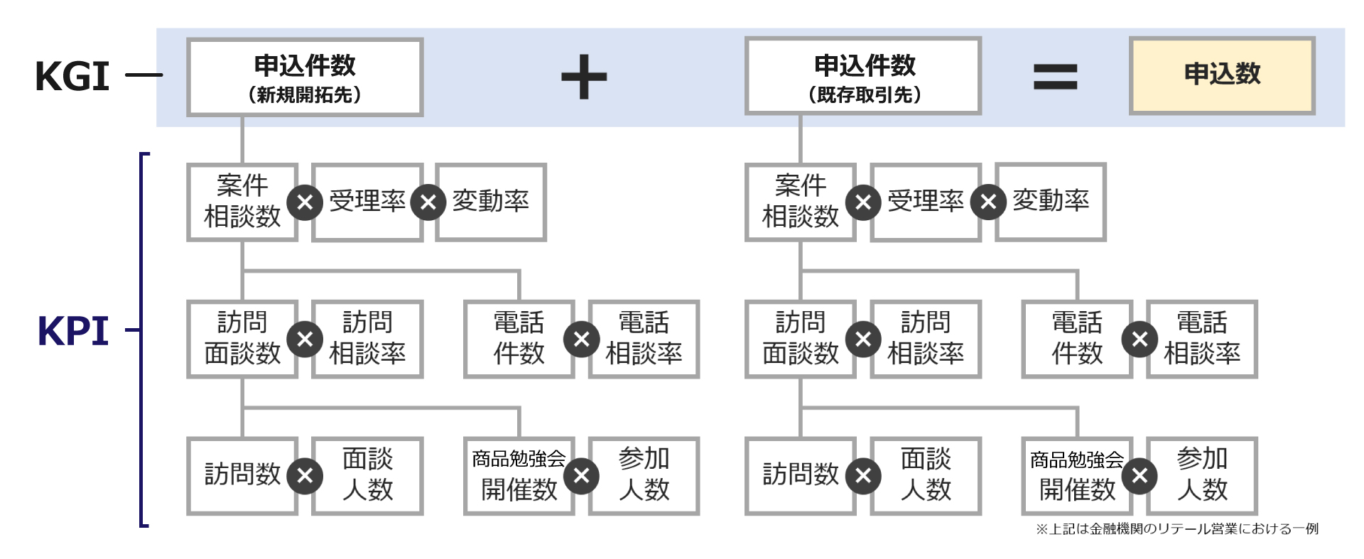 要求定義/要件定義フェーズは、ダッシュボード構築で最も重要なフェーズと言っても過言ではありません。ここでは、現状の問題・課題を確認し、ダッシュボードの目的と実現したい/解決したいことを利用する現場の方も交えて集中的に議論します。要求定義/要件定義フェーズは、ダッシュボード構築で最も重要なフェーズと言っても過言ではありません。ここでは、現状の問題・課題を確認し、ダッシュボードの目的と実現したい/解決したいことを利用する現場の方も交えて集中的に議論します。そして、営業プロセス(パイプライン)の整理を行い、KGIがどのような行動・活動(KPI)によって積み上げられているのかをツリー構造にまとめることでビジネス構造を可視化していきます。その際に、KPI管理の意味合いが強くなり過ぎてしまい、目標値との乖離を問い詰める目的にのみ使われてしまうことにならないように注意しましょう。例えば、ある事象が発生した場合に、経営・営業企画・支店などセクションごとに打てる施策・アクションを具体的に想定・整理しておくことも解決策の一つになるかもしれません。以下に、業務理解に向けたヒアリングの一部とKGI/KPIツリーをご紹介します。