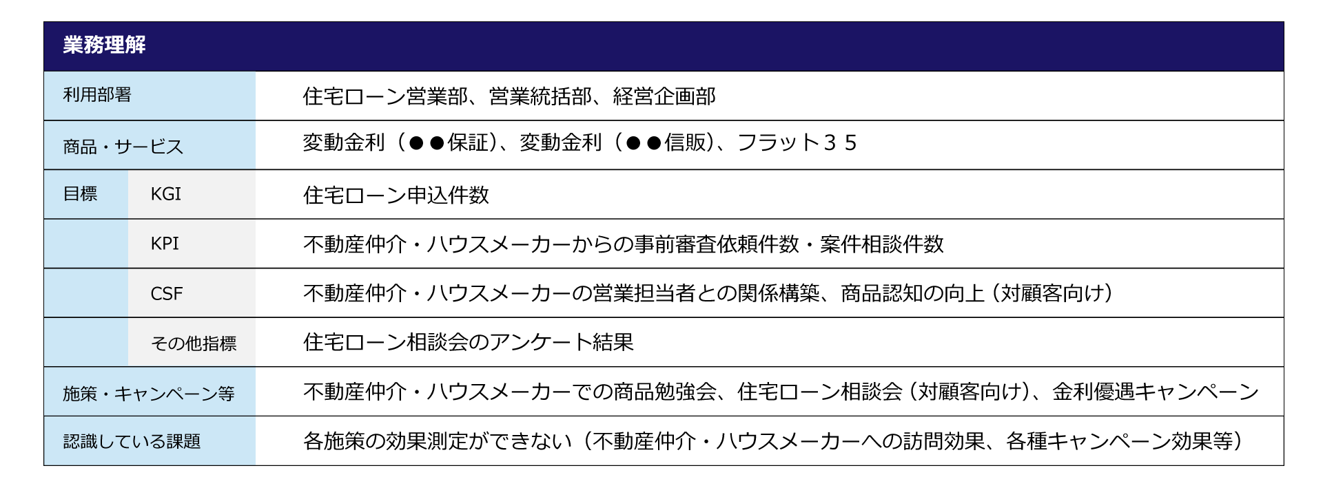 住宅ローン申込の流れを大きく分けると、住宅購入の流れの中でお客様が住宅関連事業者(不動産会社・ハウスメーカー等)に相談するケースと、お客様が金融機関に直接相談されるケースの2パターンがあります。それぞれのパターンで施策や活動内容が異なるため、本部と現場の両方からヒアリングを行い、同時に分析に活用できるデータの所在や課題感を整理します。