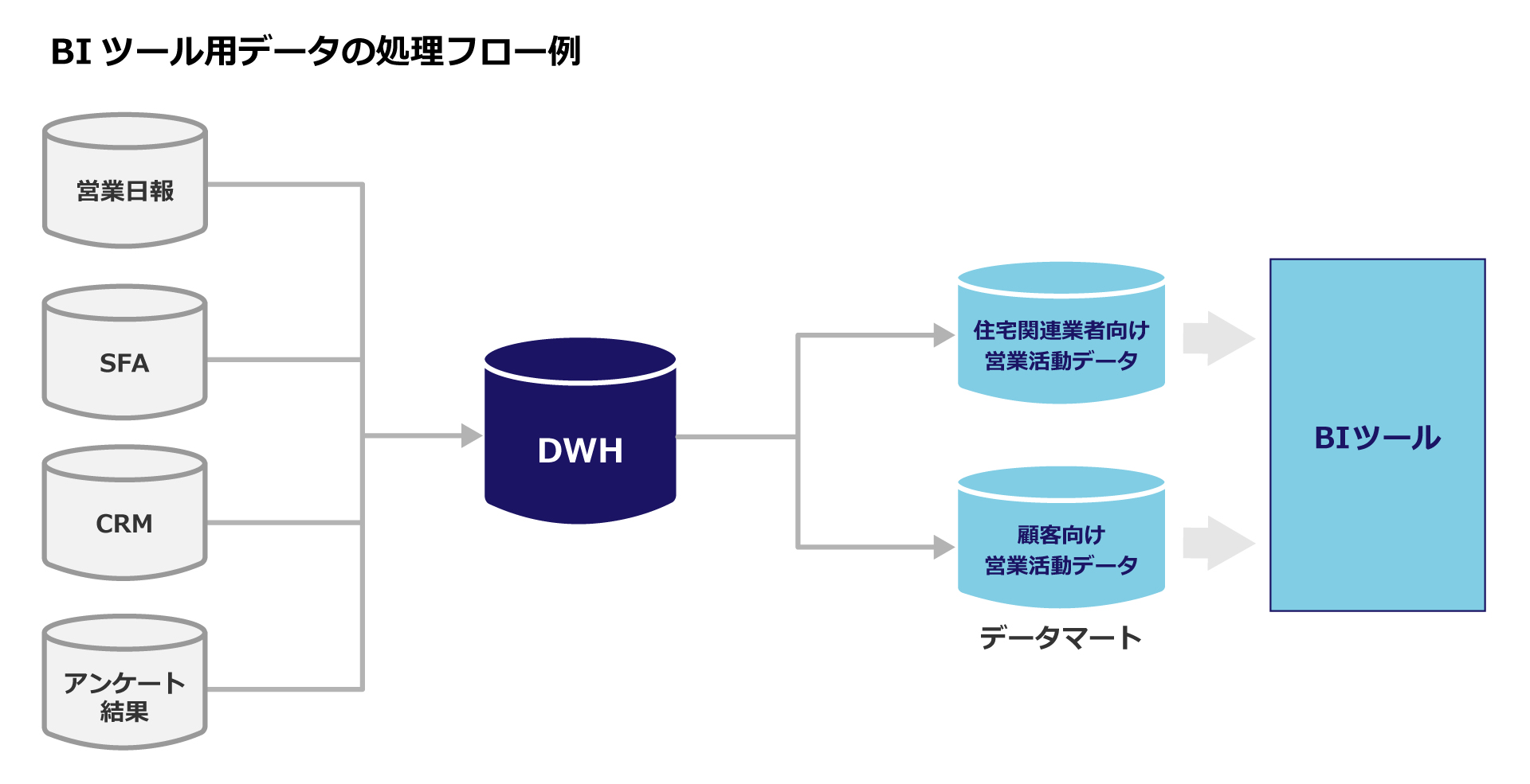 BIツールに連携するデータの準備を行います。下図は一般的なデータ処理の流れです。各所に存在するデータをDWH(データウェアハウス)に集約し、予め定義したダッシュボード用データ項目に統合・加工してデータマートを作成してBIツールに連携します。