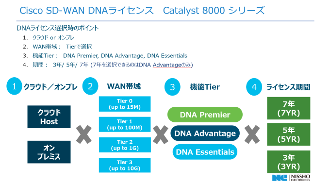 Catalyst 8000シリーズのライセンス型番は、SD-WAN/非SD-WANルーターのどちらの使用形態であっても、ライセンス型番はDNAライセンスで統一され、非常にわかりやすい体系となりました。