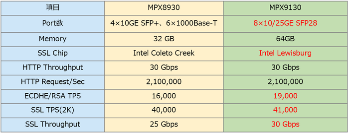 特にMPX9130のSSL TPS(2K)の値はA社製品のHTTP Throughputが40Gbpsと上位モデルにも関わらず、1.5倍の性能を誇ります。