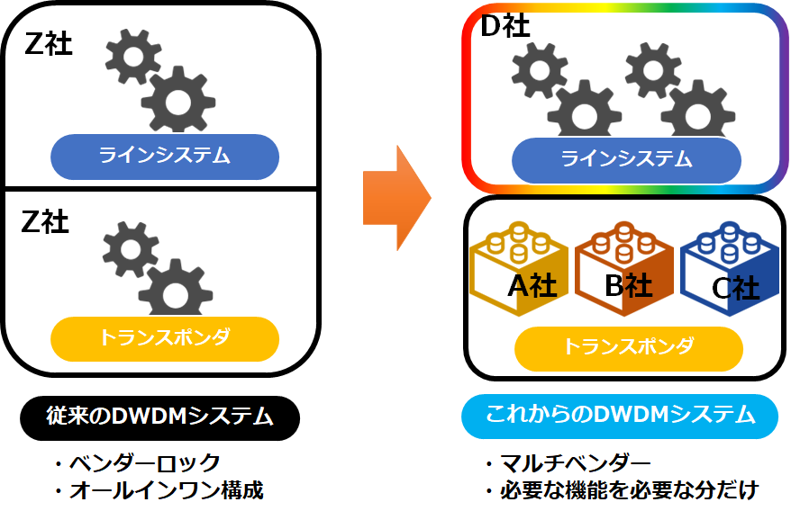 今までのDWDM伝送装置ではメーカー独自の仕様やプロトコルで実装された、オールインワンの装置が主流でしたが、