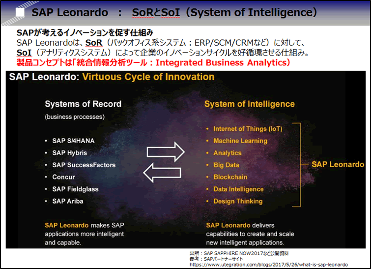 外資系ベンダの次世代ERP開発ロードマップには、既にAI機能を搭載したソリューションやAI機能によって得られる成果について紹介されています。ERP老舗大手の独SAPは、次期ERPシステムであるS/4HANAの実行系システム(SoR)に対応する情報系システムとして、SAP Leonardo(エスエーピー・レオナルド)というソリューション群について紹介されています。SAPでは、機械学習やブロックチェーン、IoTといった膨大なデータを取扱う次世代のビジネス・アナリティクスの中にAI機能が組込まれています。(SAPでは、統合情報分析ツール:Integrated Business Analyticsと呼ぶ)このSAP Leonardoが提供するAI機能と役割は、ERPのデータベースに蓄積されたデータをリアルタイム分析して即時にシミュレーションを行いその予測を提案してユーザーへ最適な選択を提案します。AI機能の強みは、人間では処理できない膨大なデータを一瞬で処理してその結果から予測することですが、SAPではデータベースにAI機能を組込むことでその処理スピードをリアルタイムに行うことを目指しています。人間の役割は、データを収集・分析するといった“作業すること”から、ERPとAIがシミュレーションして提案した選択肢を“選ぶこと”へと変わります。これまで業務時間の大半がデータの検索、収集、分析といったオペレーション作業でしたが、これからは提案された選択をじっくり検討して選択することに時間を掛けることになります。『AIが人間の作業を奪うことになる』という人も多いようですが、誰でも出来るオペレーション作業しか出来ない人にはその通りなのかもしれません。しかし、仕事の大半には人の判断が必要とされていますから、人の役割が無くなる可能性は低いと思います。むしろ人手不足でもRPAやAIが作業処理を代行して、限られた人員で効率良く業務を捌くためには、こうした手段が有効だと思われます。AI機能の区分からも分かる通り、数値解析やシミュレーションなど機能は経営者や管理者に便利な機能を提供します。画像認識、音声認識、対話応答などは担当者のオペレーションを支援する機能を提供するでしょう。こうした機能を搭載した次世代ERPは、これまで以上のコスト削減や効率化に役立つ存在になることが期待されています。