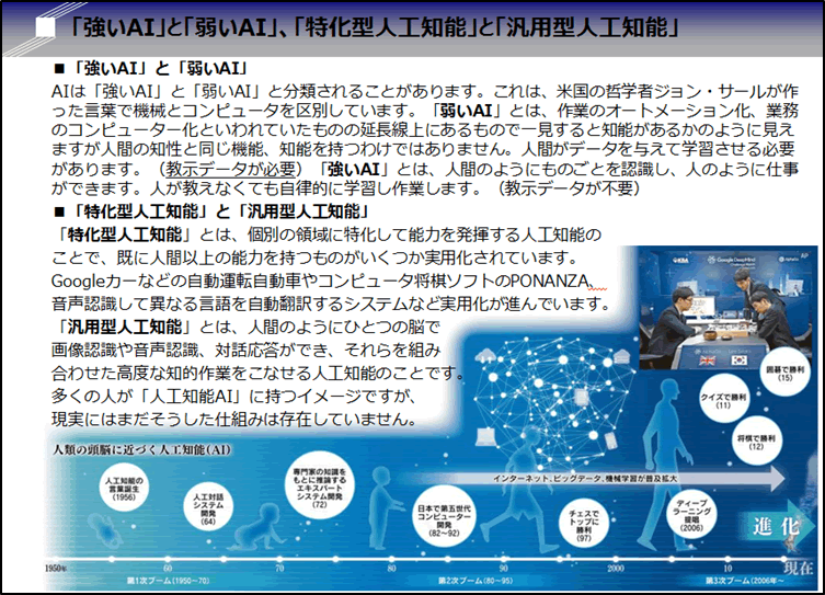 さて現実のAIですが、IBM Watson導入によるみずほ銀行のコールセンター業務支援システム構築やテスラなど自動車メーカーが開発を進めている自動運転自動車などがAI技術の最先端です。つまり日米が同じイメージを持つ「コンピュータが人間のように、聞いたり、話したりする技術」ではありません。個別の領域に特化して能力を発揮するAIを「特化型人工知能」と言います。現実のAIは、画像認識(自動運転や顔認証など)、音声認識(自動筆記や文脈解析など)、対話応答(会話や翻訳など)、数値解析(統計処理やシミュレーションなど)などそれぞれ異なる機能です。しかし、その裏側にある技術には、機械学習や深層学習などと言った人工知能研究で開発された仕組みが使われています。まだ1つの仕組み(脳/システム)で汎用的な能力を実現できませんが、将来AI技術が進んで、人間のようにひとつの脳でいろいろな能力を持つ「汎用型人工知能」がいずれ登場すると予想されています。それまでには、まだ20年以上の時間が掛かると言われています。(2045年問題、シンギュラリティなど)