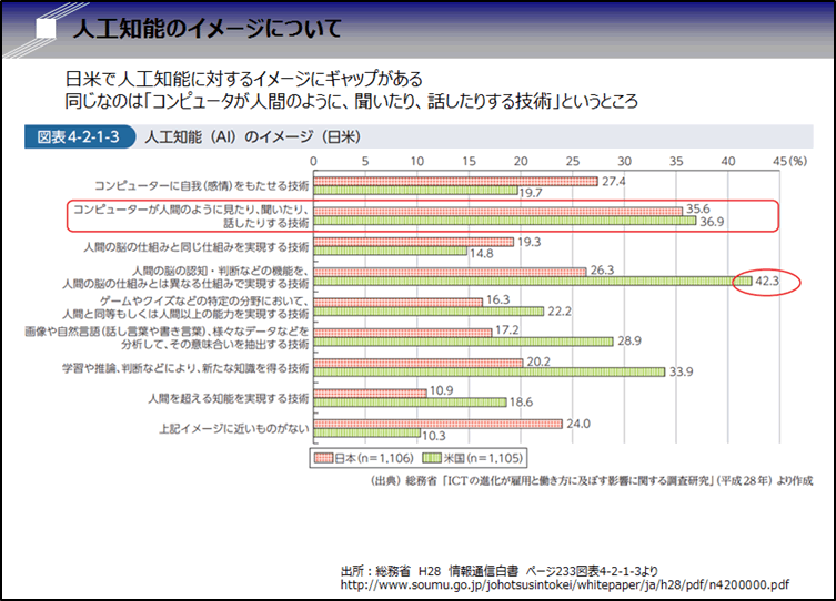 総務省が作成している平成28年度の「情報通信白書(ページ233図表4-2-1-3)」には、人工知能(AI)イメージの日米比較が紹介されています。日米で人工知能に対するイメージが同じだったのは「コンピュータが人間のように、聞いたり、話したりする技術(日本35.6% vs 米国36.9%)」という回答だけです。実は日本と米国では、AIに対するイメージにギャップがあります。日本の方が米国よりもYesと回答している比率が高いのは「コンピュータに自我(感情)をもたせる技術(日本27.4% vs 米国19.7%)」、「人間の脳の仕組みと同じ仕組みを実現する技術(日本19.3% vs 米国14.8%)」です。逆に米国の方がYesと回答しているのは「人間の脳の認知・判断などの機能を、人間の脳の仕組みとは異なる仕組みで実現する技術(日本26.3% vs 米国42.3%)」、「学習や推論、判断などにより、新たな知識を得る技術(日本20.2% vs 米国33.9%)」などです。日本は、AIに人間的なイメージを重ねていますが、米国は人間とは異なる仕組みで人間を超越した存在というイメージがあるようです。事実、米国の科学者やメディアはAIやロボットの進化に脅威を感じる意見が数多く見られます。日本でも、AIが現在の仕事を奪いかねないという意見もあるのですが概ねAIやロボットは擬人化されています。もしかすると、その理由はアトムやドラえもんなどアニメ文化に慣れ親しんでいる日本人と、ターミネーターやスカイネットが人間を支配するハリウッド文化の違いなのかもしれません。