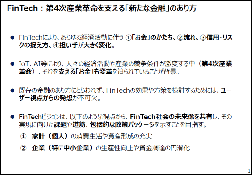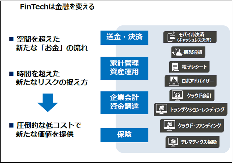 フィンテックと言うと、多くの人がイメージするのは“ブロックチェーン”という言葉ではないでしょうか。ブロックチェーンとは、ビットコインやイーサリアムなどの仮想通貨のコアテクノロジーとして使われている技術で、「分散型台帳技術」と呼ばれる技術です。その内容についてここでは詳しく説明しませんが、従来の銀行システムでは膨大なデータを処理する取引台帳を1つの巨大なサーバで処理するのではなく、ネットワーク上の複数サーバに分散して処理する技術です。これによって、銀行システムのコストが劇的に下がると言われています。しかし、仮想通貨機能のブロックチェーン以外にも、決済機能の電子マネー、海外送金機能、スマートフォンなどによるP2P送金機能、シェアリングやクラウドファンディング、AIなどを使った投資サービス提供、履歴データから個人ごとの嗜好に合わせた消費誘導サービスなどお金に関連するあらゆるテクノロジーがこのカテゴリーに入っています。身近なところでは、Amazonや楽天と言った日常良く利用するEC(電子商取引)で、個人ごとに推奨する商品やサービスが違っているのはご存知の通りです。こうした機能もブラウザのクッキーと購入履歴データを利用したフィンテックのひとつです。経済産業省では、フィンテックが経済活動に及ぼす影響や課題など総合的な報告・提言として「FinTechビジョン」を取りまとめて公開しています。
