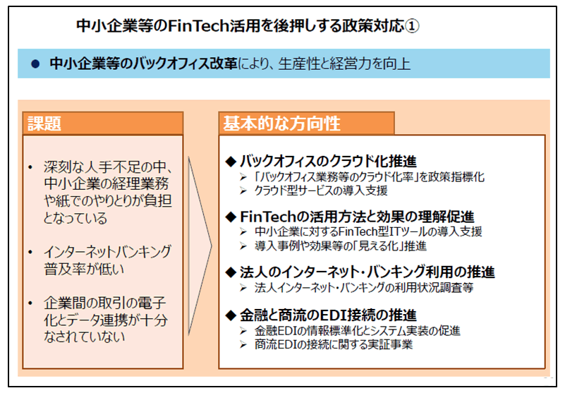 フィンテックと言うと、仮想通貨や特殊なサービスというイメージを思い描きやすいのですが、企業間取引においてはオンラインバンキングや債権債務のリアルタイム管理による資金管理業務の効率化と言った即効性の高い効果が期待できます。中小企業におけるフィンテック活用は、以下の4つの方向性で取り組みが進んでいます。(「FinTechビジョン」概要資料頁20より)