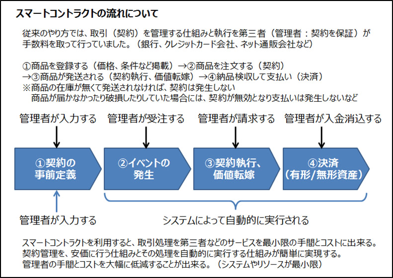 ①契約の事前定義→②イベントの発生→③契約執行/価値転嫁→④決済