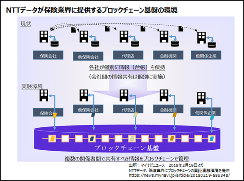 こうしたブロックチェーンのサービスは、今後さらに拡大していくと思われます。そして、こした技術の開発と並行して具体的なソリューションを提供するアプリケーション開発が加速しています。2018年2月には、NTTデータが、保険業界向けにブロックチェーン基盤を提供して実証実験を開始しています。保険業務では、その契約情報を各社が個別にデータ管理(契約台帳管理)してきました。保険を取り扱う代理店と保険を販売する保険会社で台帳を管理しなければならないのですが、その管理は煩雑でタイムラグによる不整合も生じやすく管理コストも膨大です。データセンターに大規模システムを構築するやり方が一般的でしたが、最近はクラウド環境(セールスフォース・ドットコムなど)を利用した仕組みへ移行しつつありましたが、今後は更にブロックチェーン技術を利用した仕組みへと進化すると予想されます。また、ブロックチェーン3.0ではIoT対応したアフターサービスや、スマートサプライチェーン、スマートトレーサビリティなどといった金融分野以外の用途利用も拡大して行くでしょう。ERPシステムは、企業/企業グループの基幹システムとして、こうしたブロックチェーン基盤との連携で作業効率を高め、システムコストを大幅に減らすことが可能となります。