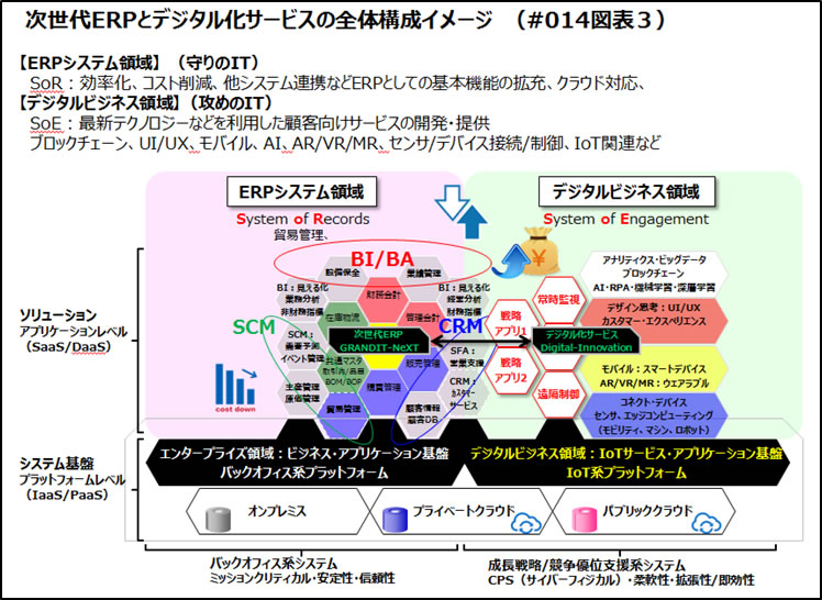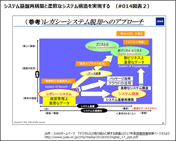 このようなデジタルイノベーションを想定したシステム構成だと、収集するデータ容量もネットワークでつなぐ製品(顧客が所有するハードウェア)が飛躍的に増えていきます。つまり、従来のオンプレミスのシステムではコストやスケールの限界があります。大量に収集されるデータを管理するためにはクラウドストレージが必要となります。また、顧客ごとにサービスを提供するためには様々なクラウド基盤を利用したアプリケーション開発や大量の処理能力が必要となります。つまり、このシステムを実現するためにはクラウドの利用が必須となります。また、デジタル化したサービスを提供するマイクロサービスは、ERPの機能と連動したシステムであるため出来るだけシンプルで確実な仕組みが必要となります。つまり、オンプレミスとクラウドの混在するハイブリット型のシステムや、複数のクラウドをまたがるマルチクラウド型のシステムとなります。このようなシステム連携は、クラウドインテグレーションと呼ばれる新しいシステム統合技術となります。古いシステムのデータ連携は、ファイルによる連携やバッチ処理による連携でしたが、最近ではWebAPIによる連携が一般的です。(REST APIなど)10年以上前のERPシステムでは、こうしたAPI連携には対応していないものも多くこれが将来ボトルネックとなります。デジタルイノベーションを実現して、他社に対する優位性を維持するためには、ERPシステムも新しく整えた方が良いでしょう。ERP再生によるメリットは、デジタルイノベーションでも有効だと思います。JUASが考えるレガシーシステム脱却へのアプローチでは、システム基盤再構築を行ってうえで、柔軟なシステム構造を「パッケージ活用」と「クラウドの活用」するというものです。デジタルイノベーションを実現するシステム全体のイメージを御覧ください。(図表2、図表3)