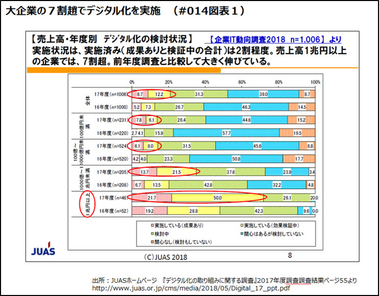 前回ご紹介した通り日本情報システム・ユーザー協会(JUAS)が最近公開した「デジタル化の取り組みに関する調査」2017年度調査結果では、デジタル化の取り組みは大企業から中堅中小企業へ普及が広がっています。(図表1)先行する欧米企業のデジタル化に追いつくために、日本企業はペースをあげてデジタル化に取り組むことが予想されます。しかし、表面的なデジタル化にはリスクが潜んでいます。それは、トップダウンでデジタル化を進める欧米とボトムアップ/カイゼン手法でデジタル化に取り組む日本の文化の違いによるものです。日本におけるデジタル化は内向きの取り組みが多く、現場担当者の業務のやり方(属人的な手作業)を高機能センサーなど使ってピンポイントにデータを収集するやり方です。このやり方の問題点は、業務のやり方が担当者ごと違っているケースが多いというものです。結果として、担当者ごとに業務のやり方が違うのをそのままデジタル化しても、ここから得たデータはバラつくことになります。苦労して収集したデータですが、データ粒度やデータ品質が揃わないため期待した通りの効果が出ないことが想定されています。
