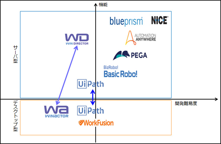 国内で最も普及しているRPA製品は、NTTアドバンステクノロジ(NTT-AT)が開発した「WinActor(ウィンアクター)」(販売元NTTデータ)で、2018年10月現在で既に2,000社以上が導入しています。RPAの導入期間は、約1ヶ月~3ヶ月間と短期間で導入することが出来ます。「WinActor」はデスクトップ版のRPAですが、サーバやPC上にインストールされた「WinActor」を統制管理する「WinDirector(ウィンディレクター)が最近提供されサーバ版と組み合わせて利用出来ます。つまり、エラーや不具合などで動作が止まったり、管理者不在で暴走したりする(野良ロボットと呼ぶそうです)RPAをモニタリングすることが出来るようです。さながら、放牧された羊を追う牧羊犬のような存在でしょうか。