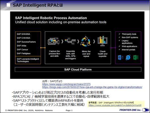 インテリジェントRPAとは、人の作業手順(オペレーション)を自働化するのではなくデータを主体にて自動処理する新しい考え方を一歩進めた自動処理機能を持つのがインテリジェントRPAです。従来のRPAでは、人間の作業をそのままなぞって複数システムごとに手順通り1つ1つ起動してデータを処理して作業するので、これを仮にオペレーショナルRPAと呼びます。これに対して、インテリジェントRAPでは、各システムのデータをプラットフォーム上に読み込んでそのデータを手順に沿って処理するという仕組みです。違っている点は、「プラットフォームにデータを読み込んでから、そのデータを手順に従って一気に処理する」という点です。SAPでは、ERPや他システムからSAP Cloud Platform にAPIを介してデータを書き込んでから自動処理します。ブラックラインも同様にERPやWeb、ExcelファイルなどからAPIを介してモダンファイナンスプラットフォームと呼ぶ自社のクラウド基盤にデータを読み込んで、データを自動処理します。APIを介しているため、なんらかの理由でエラーやシステムの変更があってもデータが正しく読み込まれていれば問題なく処理されます。また、データが正しく読み込まれていない場合には、アラートが出て処理は行われません。つまり、野良RPAのような暴走が起こる可能性は低いと考えられます。SAPでは、この仕組を業務処理ごとにテンプレート化したチャットボットとして利用しています。対象となるデータがERPのマッピングに沿ったデータテーブルにあるものを参照しているため、ファイナンスや調達、サプライチェーンといった業務処理ごとにデータを取り出してテンプレート化することが出来ます。現時点で既に12万以上のチャットボットが開発されていて、手作業のタスクのうち80~90%は自働化可能であるアナウンスされています。また、ブラックラインはファイナンス業務に特化したクラウドサービスを提供していますが、ブラックライン社のモダンファイナンスプラットフォーム上にデータを集めることで、突合処理やネッティング処理の自働化を行うことが可能です。